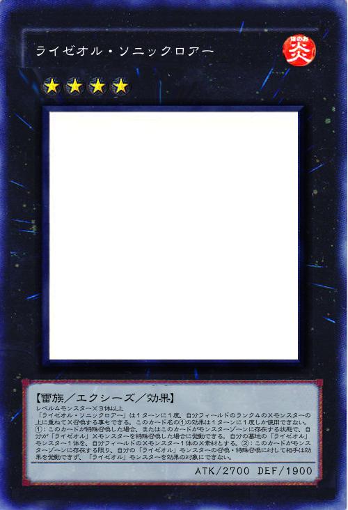 | レベル4モンスター×3体以上 「ライゼオル・ソニックロアー」は1ターンに1度、自分フィールドのランク4のXモンスターの上に重ねてX召喚する事もできる。このカード名の①の効果は1ターンに1度しか使用できない。①:このカードが特殊召喚した場合、またはこのカードがモンスターゾーンに存在する状態で、自分が「ライゼオル」Xモンスターを特殊召喚した場合に発動できる。自分の墓地の「ライゼオル」モンスター1体を、自分フィールドのXモンスター1体のX素材とする。②:このカードがモンスターゾーンに存在する限り、自分の「ライゼオル」モンスターの召喚・特殊召喚に対して相手は効果を発動できず、「ライゼオル」モンスターを効果の対象にできない。 | |||