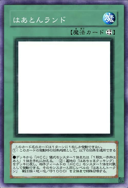 | このカード名のカードは1ターンに1枚しか発動できない。 ①:このカードの発動時の効果処理として、以下の効果を適用できる。 ●デッキから「HCC」儀式モンスター1体または「1期生-赤井はあと」1体を手札に加える。 ②:墓地の「はあちゃまクッキング」をデッキに戻し、相手フィールドの「HCC」モンスター1体を対象として発動できる。そのモンスターと同じレベルの「はあとんトークン」(戦士族・地・攻/守1000)を2体まで特殊召喚する。 | |||