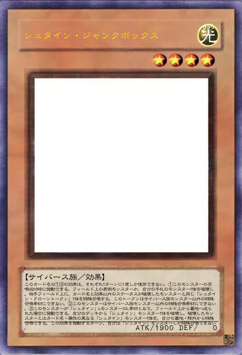 | このカード名の①③の効果は、それぞれ1ターンに1度しか使用できない。①このモンスターの召喚成功時に発動できる。フィールド上の表側モンスターか、自分の手札のモンスター1体を破壊し、相手フィールド上に、カード名と効果以外のステータスが破壊したモンスターと同じ「シュタイン・クローントークン」1体を特殊召喚する。このトークンはサイバース族モンスター以外の特殊召喚素材にできない。②このモンスターはサイバース族モンスター以外の特殊召喚素材にできない。③このモンスターが「シュタイン」LモンスターのL素材となり、フィールド上から墓地へ送られた場合に発動できる。自分のデッキから「シュタイン」モンスター1体を破壊し、破壊したモンスターとはカード名・属性の異なる「シュタイン」モンスター1体を、自分の墓地・除外から特殊召喚できる。この効果を発動するターン、自分は「シュタイン」モンスターしか特殊召喚できない。 | |||