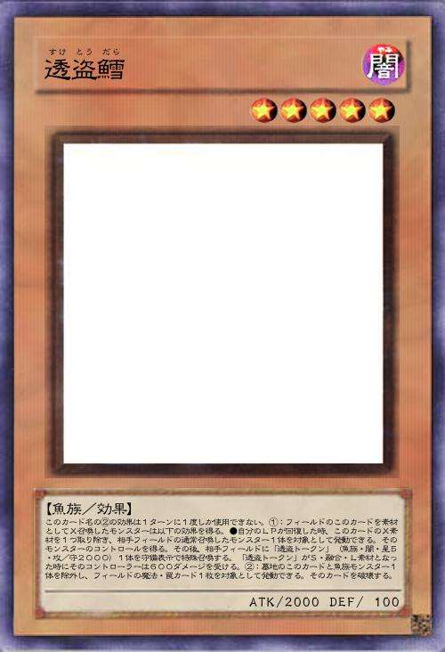 | このカード名の②の効果は1ターンに1度しか使用できない。①:フィールドのこのカードを素材としてX召喚したモンスターは以下の効果を得る。●自分のLPが回復した時、このカードのX素材を1つ取り除き、相手フィールドの通常召喚したモンスター1体を対象として発動できる。そのモンスターのコントロールを得る。その後、相手フィールドに「透盗トークン」(魚族・闇・星5・攻/守2000)1体を守備表示で特殊召喚する。「透盗トークン」がS・融合・L素材となった時にそのコントローラーは600ダメージを受ける。②:墓地のこのカードと魚族モンスター1体を除外し、フィールドの魔法・罠カード1枚を対象として発動できる。そのカードを破壊する。 | |||