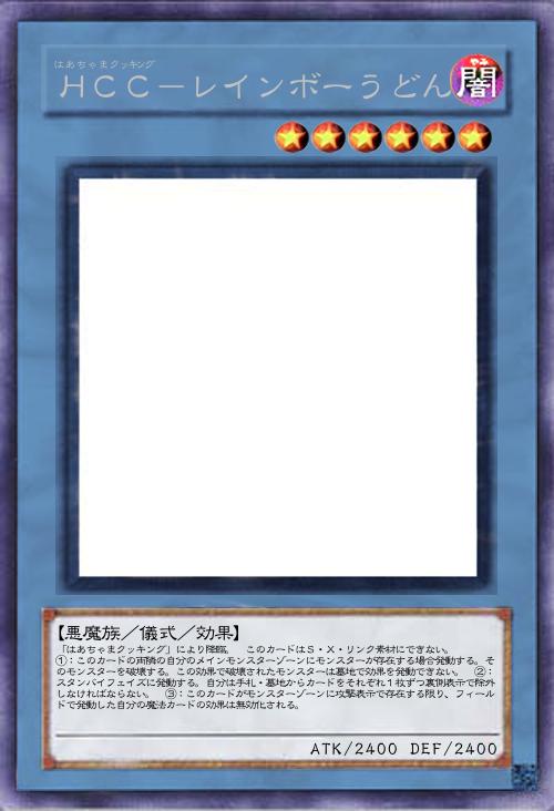| 「はあちゃまクッキング」により降臨。 このカードはS・X・リンク素材にできない。 ①:このカードの両隣の自分のメインモンスターゾーンにモンスターが存在する場合発動する。そのモンスターを破壊する。この効果で破壊されたモンスターは墓地で効果を発動できない。 ②:スタンバイフェイズに発動する。自分は手札・墓地からカードをそれぞれ1枚ずつ裏側表示で除外しなければならない。 ③:このカードがモンスターゾーンに攻撃表示で存在する限り、フィールドで発動した自分の魔法カードの効果は無効化される。 | |||