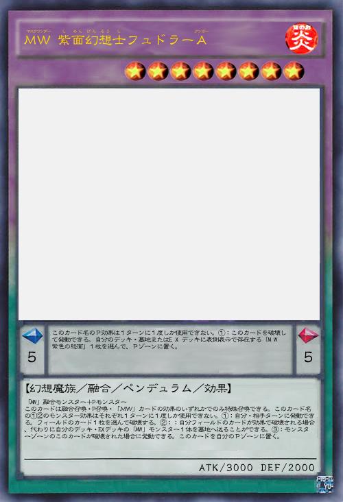 | 「MW」融合モンスター+Pモンスター このカードは融合召喚・P召喚・「MW」カードの効果のいずれかでのみ特殊召喚できる。このカード名の①②のモンスター効果はそれぞれ1ターンに1度しか使用できない。①:自分・相手ターンに発動できる。フィールドのカード1枚を選んで破壊する。②::自分フィールドのカードが効果で破壊される場合、代わりに自分のデッキ・EXデッキの「MW」モンスター1体を墓地へ送ることができる。③:モンスターゾーンのこのカードが破壊された場合に発動できる。このカードを自分のPゾーンに置く。 | |||