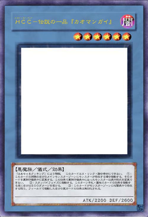 | 「はあちゃまクッキング」により降臨。 このカードはX・リンク・融合素材にできない。 ①:このカードの両隣の自分のメインモンスターゾーンにモンスターが存在する場合発動する。そのカードを裏側守備表示に変更する。この効果で裏側守備表示になったモンスターは表示形式を変更できない。 ②:スタンバイフェイズに発動する。このターン手札・墓地でカードの効果を発動する度に自分は500ダメージを受ける。 ③:このカードがモンスターゾーンに攻撃表示で存在する限り、フィールドで発動した自分の罠カードの効果は無効化される。 | |||