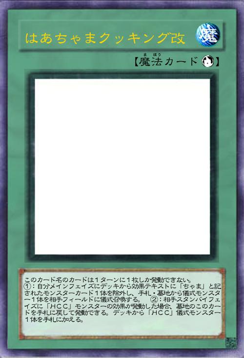 | このカード名のカードは1ターンに1枚しか発動できない。 ①:自分メインフェイズにデッキから効果テキストに「ちゃま」と記されたモンスターカード1体を除外し、手札・墓地から儀式モンスター1体を相手フィールドに儀式召喚する。 ②:相手スタンバイフェイズに「HCC」モンスターの効果が発動した場合、墓地のこのカードを手札に戻して発動できる。デッキから「HCC」儀式モンスター1体を手札に加える。 | |||