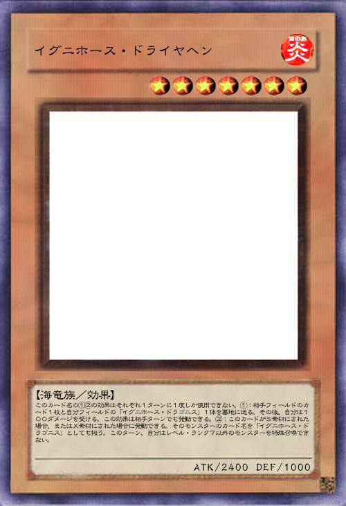 | このカード名の①②の効果はそれぞれ1ターンに1度しか使用できない。①:相手フィールドのカード1枚と自分フィールドの「イグニホース・ドラゴニス」1体を墓地に送る。その後、自分は100ダメージを受ける。この効果は相手ターンでも発動できる。②:このカードがS素材にされた場合、またはX素材にされた場合に発動できる。そのモンスターのカード名を「イグニホース・ドラゴニス」としても扱う。このターン、自分はレベル・ランク7以外のモンスターを特殊召喚できない。 | |||