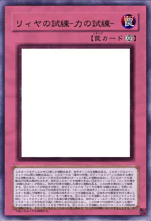 | このカードはデュエル中に1度しか発動出来ず、相手ターンのみ発動出来る。このカードはメインフェイズ2以降に発動出来ない。このカードは「運命の祭壇」がフィールドゾーンに存在する場合のみ発動出来る。このカード名の②の効果は1ターンに1度しか発動出来ない。①このカードの発動及び効果は無効化されず、相手はこのカードを破壊できない②自分フィールドに「リィヤの導き-試練の巫女-」が存在し、相手が効果を発動した場合に発動出来る。この効果を無効にして破壊する。③このカードが存在する限り、自分フィールドの「リィヤの導き-試練の巫女-」を除いたレベル12モンスターに以下の効果を付与する⚫︎1ターンに1度相手フィールドの表側表示のモンスターを選んで破壊する。この効果は相手ターンでも発動出来る。④相手が攻撃宣言を行う度にこのカードに「リィヤカウンター」を一つ乗せる。⑤このカードを発動したターンのエンドフェイズ時に「リィヤカウンター」が3つ未満の場合発動出来る。相手はフィールド・手札・デッキからモンスターカードを10枚まで選んで除外しなければならない。この効果で10枚除外しなかった場合さらに相手のデッキのカードを全て除外する。⑥このカードを発動した次のドローフェイズ開始時に発動出来る。手札・デッキからこのカード名と異なる「リィヤの試練」カードをセットする。その後このカードを破壊する。 | |||