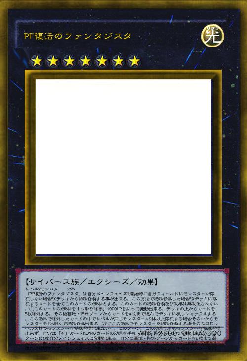 | レベル7モンスター✖︎2体 「PF復活のファンタジスタ」は自分メインフェイズ1開始時に自分フィールドにモンスターが存在しない場合EXデッキから特殊召喚する事が出来る。この方法で特殊召喚した場合EXデッキに存在するカードを全てこのカードのX素材とする。このカードの特殊召喚及び効果は無効化されない。①このカードのX素材を1つ取り除き、1000LPを払って発動出来る。デッキの上からカードを5枚除外する。その後墓地・除外ゾーンからカードを4枚まで選んでデッキに戻しシャッフルする。この効果で除外したカードの中でレベルが同じモンスターが2体以上存在する場合その中からモンスターを1体選んで特殊召喚出来る(次にこの効果でモンスターを特殊召喚する場合のみ同じレベルを持つモンスターを特殊召喚出来ない)。このターン、この効果で同名モンスターを特殊召喚出来ず、自分は「PF」カード以外のカードの効果を手札・墓地・除外ゾーンで発動出来ない。②1ターンに1度自分メインフェイズに発動出来る。自分の墓地・除外ゾーンからカードを5枚まで選んでデッキ・EXデッキに戻す。その後デッキをシャッフルする。③ このカードは戦闘・効果で1度だけ破壊されず、モンスターの召喚・特殊召喚の為のリリース及びEXデッキのモンスターを出すための素材として使用できない。 | |||