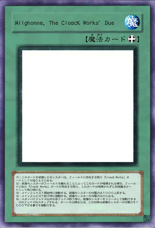 | (1):このカードを装備したモンスターは、フィールドに存在する限り「CloacK Works」カードとしても扱うようになる。 (2):装備モンスターがフィールドを離れることによってこのカードが破壊される場合、フィールドに他の「CloacK Works」カードが存在する限り、このカードは破壊されずに永続魔法カードとして残り続ける。 (3):メインフェイズ1開始時に発動する。装備モンスターの攻撃力は1000上昇する。 (4):メインフェイズ1終了時に発動する。装備モンスターの攻撃力は0になる。 (5):スタンバイフェイズ以外の各フェイズ終了時に、装備モンスターをリリースして発動できる。次のフェイズはスキップされる。ターン6以降ならば、この効果は装備モンスターの攻撃力を1000下げる事でも発動できる。 | |||
