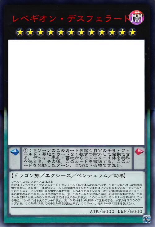 | レベル12モンスター×2体以上 自分は「レベギオン・デスフェラード」をフィールドに1体しか存在出来ず、1ターンに1度しか特殊召喚できない。このカードは自分フィールドの闇属性のランク12またはリンク6のモンスターをレベル12のモンスターとして扱いX召喚する事もでき、レベル12のモンスターがP召喚可能な場合にEXデッキの表側表示のこのカードはP召喚できる。①:このカードがX召喚に成功した場合に発動できる。このカードを除くお互いのモンスターを全て持ち主の手札に戻す。このカードがLモンスターを素材にしている場合、代わりに持ち主のデッキに戻す。②:X素材を3つ取り除いて発動できる。攻撃力を3000アップする。この効果に対して相手は効果を発動出来ず、このターン、他のカードの効果を受けない。 | |||
