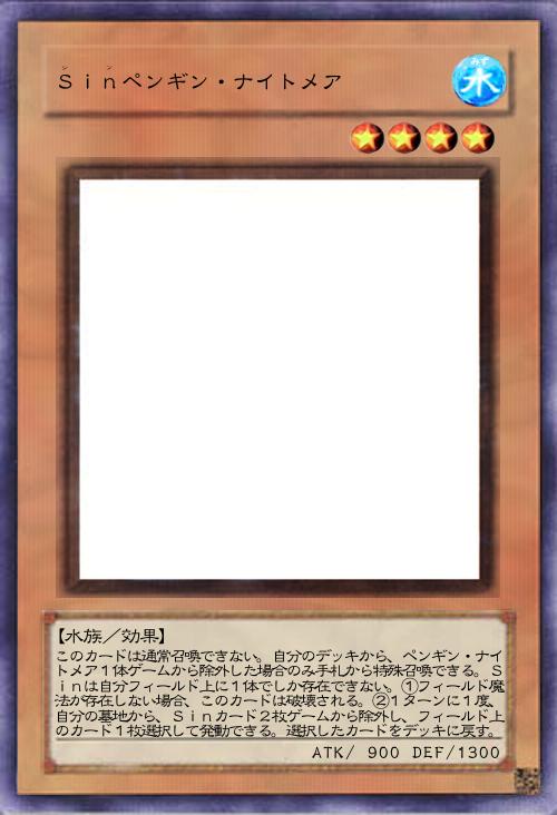 | このカードは通常召喚できない。自分のデッキから、ペンギン・ナイトメア1体ゲームから除外した場合のみ手札から特殊召喚できる。Sinは自分フィールド上に1体でしか存在できない。①フィールド魔法が存在しない場合、このカードは破壊される。②1ターンに1度、自分の墓地から、Sinカード2枚ゲームから除外し、フィールド上のカード1枚選択して発動できる。選択したカードをデッキに戻す。 | |||