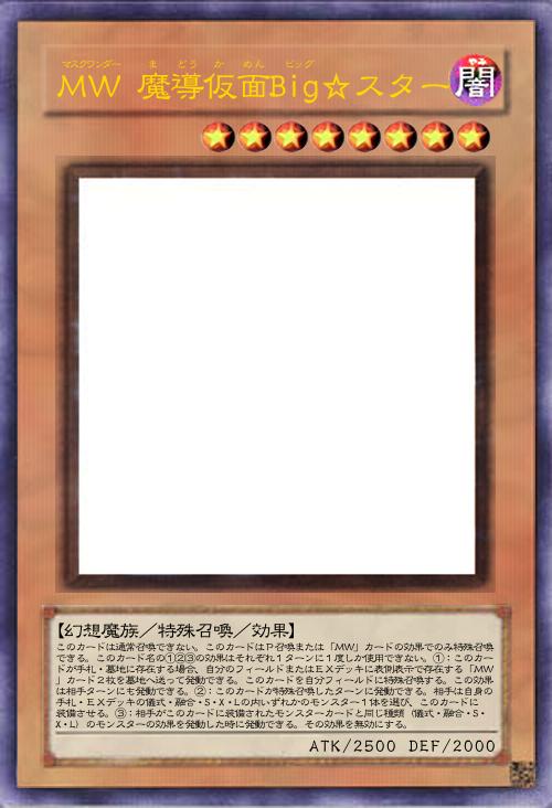 | このカードは通常召喚できない。このカードはP召喚または「MW」カードの効果でのみ特殊召喚できる。このカード名の①②③の効果はそれぞれ1ターンに1度しか使用できない。①:このカードが手札・墓地に存在する場合、自分のフィールドまたはEXデッキに表側表示で存在する「MW」カード2枚を墓地へ送って発動できる。このカードを自分フィールドに特殊召喚する。この効果は相手ターンにも発動できる。②:このカードが特殊召喚したターンに発動できる。相手は自身の手札・EXデッキの儀式・融合・S・X・Lの内いずれかのモンスター1体を選び、このカードに装備させる。③:相手がこのカードに装備されたモンスターカードと同じ種類(儀式・融合・S・X・L)のモンスターの効果を発動した時に発動できる。その効果を無効にする。 | |||