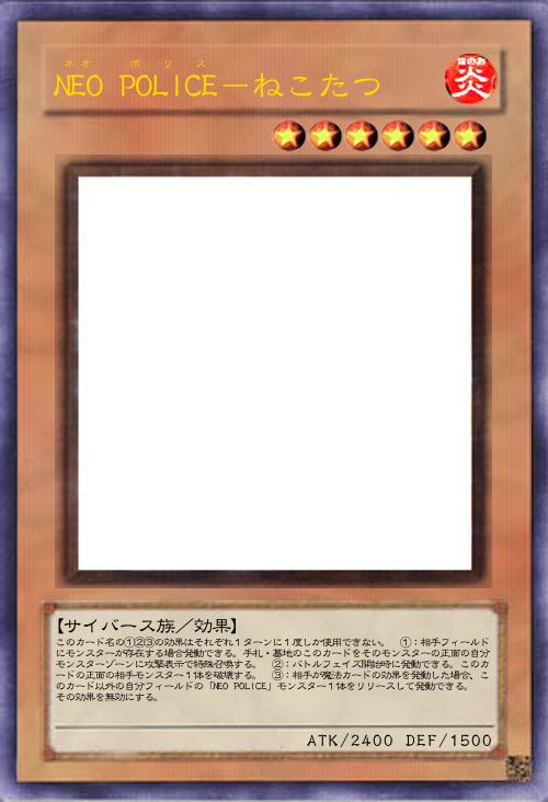 | このカード名の①②③の効果はそれぞれ1ターンに1度しか使用できない。 ①:相手フィールドにモンスターが存在する場合発動できる。手札・墓地のこのカードをそのモンスターの正面の自分モンスターゾーンに攻撃表示で特殊召喚する。 ②:バトルフェイズ開始時に発動できる。このカードの正面の相手モンスター1体を破壊する。 ③:相手が魔法カードの効果を発動した場合、このカード以外の自分フィールドの「NEO POLICE」モンスター1体をリリースして発動できる。その効果を無効にする。 | |||