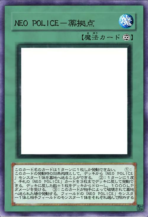 | このカード名のカードは1ターンに1枚しか発動できない。 ①:このカードの発動時の効果処理として、デッキから「NEO POLICE」モンスター1体を墓地へ送ることができる。 ②:1ターンに1度、手札の「NEO POLICE」カードを3枚までデッキに戻して発動できる。デッキに戻した数+1枚をデッキからドローし、1000LPダメージを受ける。 ③:このカードが相手によって破壊されて墓地へ送られた場合発動する。フィールドの「NEO POLICE」モンスター1体と相手フィールドのモンスター1体をそれぞれ選んで除外する。 | |||