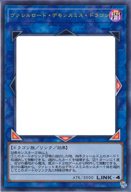 | 効果モンスター2体以上 ①このカードがリンク召喚に成功した時、相手フィールド上のカード1枚選択して発動できる。選択したカードを破壊する。②1ターンに1度、自分の墓地から魔法、罠カード2枚ゲームから除外して発動できる。自分の墓地から、ヴァレットまたはデモンスミスモンスター1体を選択してこのカードのリンク先に特殊召喚する。 | |||