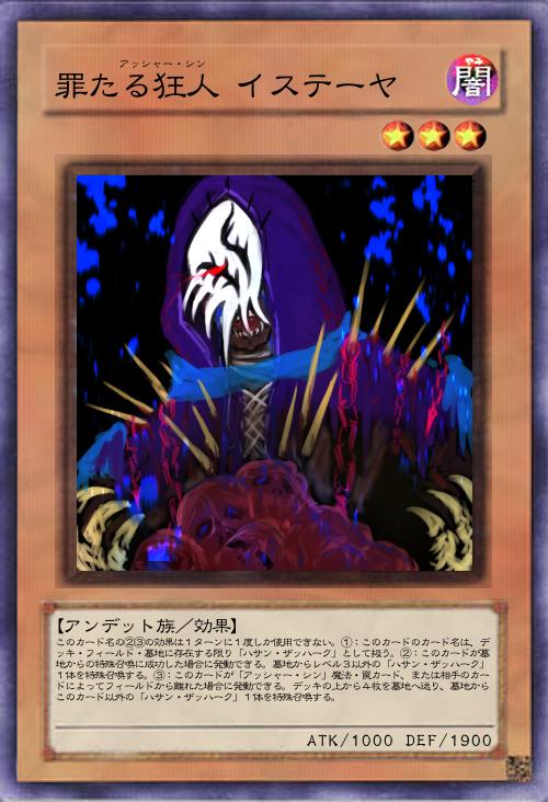 | このカード名の②③の効果は1ターンに1度しか使用できない。①:このカードのカード名は、デッキ・フィールド・墓地に存在する限り「ハサン・ザッハーク」として扱う。②:このカードが墓地からの特殊召喚に成功した場合に発動できる。墓地からレベル3以外の「ハサン・ザッハーク」1体を特殊召喚する。③:このカードが「アッシャー・シン」魔法・罠カード、または相手のカードによってフィールドから離れた場合に発動できる。デッキの上から4枚を墓地へ送り、墓地からこのカード以外の「ハサン・ザッハーク」1体を特殊召喚する。 | |||