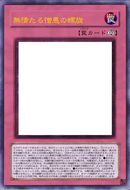 | 元々がこのカード名のカードは、自分フィールド上に1枚しか表側で存在できない。①バトルフェイズ中は、このカードの効果以外に、自分はモンスター効果を発動できず、お互いに魔法・罠の効果を発動できず、それらの効果は適用されない。②自分フィールド上に表側で存在するモンスターが1体のみで、相手フィールド上に表側で攻撃力2500以上のモンスターが存在する場合、その自分モンスターの攻撃宣言時に発動できる。以下の効果のうち、1つを選んで適用する。●自分モンスター1体の攻撃力を倍にし、攻撃対象の相手モンスターの攻撃力を、攻撃宣言した自分モンスターの攻撃力分アップさせる。その戦闘で自分が受ける戦闘ダメージは2000固定になり、相手が受けるダメージは0になる。さらに、自分のモンスターはその戦闘で破壊されず、ダメステ終了後、もう1度その相手モンスターを攻撃しなければならない。●自分のLPが2000以下で、上記効果を一度のバトルフェイズ中、4回以上適用していた場合に適用できる。攻撃対象の相手モンスターの攻撃力を倍にし、その戦闘では自分のモンスターは破壊されず、自分への戦闘ダメージは0になる。このダメステ終了時、相手は自分が本来この戦闘で受けるはずだったダメージの数値分、LPを失う。 | |||