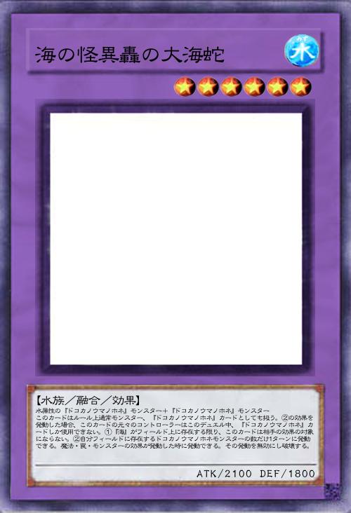 | 水属性の『ドコカノウマノホネ』モンスター+『ドコカノウマノホネ』モンスター このカードはルール上通常モンスター、『ドコカノウマノホネ』カードとしても扱う。②の効果を発動した場合、このカードの元々のコントローラーはこのデュエル中、『ドコカノウマノホネ』カードしか使用できない。①『海』がフィールド上に存在する限り、このカードは相手の効果の対象にならない。②自分フィールドに存在するドコカノウマノホネモンスターの数だけ1ターンに発動できる。魔法・罠・モンスターの効果が発動した時に発動できる。その発動を無効にし破壊する。 | |||