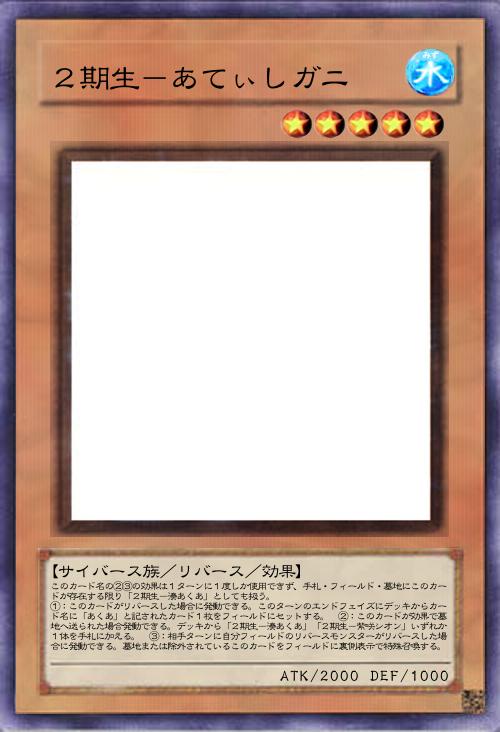| このカード名の②③の効果は1ターンに1度しか使用できず、手札・フィールド・墓地にこのカードが存在する限り「2期生-湊あくあ」としても扱う。 ①:このカードがリバースした場合に発動できる。このターンのエンドフェイズにデッキからカード名に「あくあ」と記されたカード1枚をフィールドにセットする。 ②:このカードが効果で墓地へ送られた場合発動できる。デッキから「2期生-湊あくあ」「2期生-紫咲シオン」いずれか1体を手札に加える。 ③:相手ターンに自分フィールドのリバースモンスターがリバースした場合に発動できる。墓地または除外されているこのカードをフィールドに裏側表示で特殊召喚する。 | |||