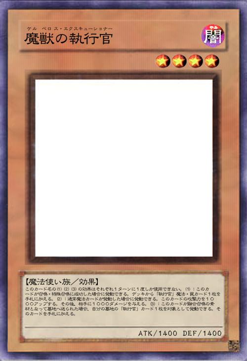 | このカード名の(1)(2)(3)の効果はそれぞれ1ターンに1度しか使用できない。(1):このカードが召喚・特殊召喚に成功した場合に発動できる。デッキから「執行官」魔法・罠カード1枚を手札に加える。(2):通常魔法カードが発動した場合に発動できる。このカードの攻撃力を1000アップする。その後、相手に1000ダメージを与える。(3):このカードが融合召喚の素材となって墓地へ送られた場合、自分の墓地の「執行官」カード1枚を対象として発動できる。そのカードを手札に加える。 | |||