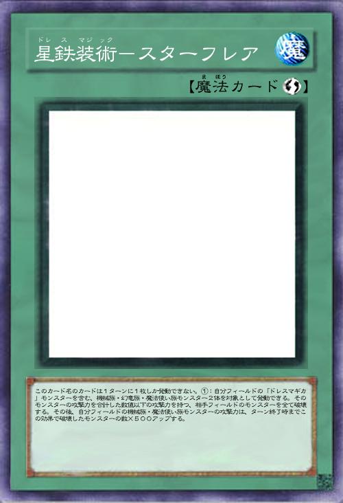 | このカード名のカードは1ターンに1枚しか発動できない。①:自分フィールドの「ドレスマギカ」モンスターを含む、機械族・幻竜族・魔法使い族モンスター2体を対象として発動できる。そのモンスターの攻撃力を合計した数値以下の攻撃力を持つ、相手フィールドのモンスターを全て破壊する。その後、自分フィールドの機械族・魔法使い族モンスターの攻撃力は、ターン終了時までこの効果で破壊したモンスターの数×500アップする。 | |||