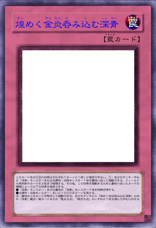 | このカード名の①②の効果はそれぞれ1ターンに1度しか使用できない。①:自分のデッキ・手札の「深青」モンスターまたは光属性・炎族モンスター1体を墓地へ送って発動できる。フィールドの表側表示カードを2枚まで破壊する。その後、この効果を発動するために墓地へ送ったカードの種類によって以下の効果を使用できる。 ●「深青」モンスター:自分の墓地の「深青」モンスター1体を特殊召喚する。 ●光属性・炎族モンスター:互いに1000ダメージを受ける。 ②:墓地のこのカードを除外して発動できる。自分のデッキから「煌めく金炎呑み込む深青」以外の「深青」魔法・罠カードまたは「聖なる炎」「裁きの炎」のいずれか1枚を選んで手札に加える。 | |||