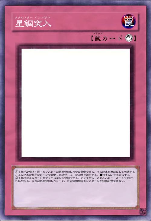 | ①:相手が魔法・罠・モンスター効果を発動した時に発動できる。その効果を無効にして破壊する。この効果が相手のターンで発動した場合、以下の効果を適用する。●相手のLPを半分にする。 ②:墓地のこのカードをデッキに戻して発動できる。デッキから「メタルスター」カードを1枚手札に加える。この効果を発動したターン、自分は機械族モンスターしか特殊召喚できない。 | |||
