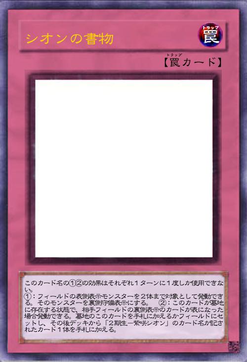 | このカード名の①②の効果はそれぞれ1ターンに1度しか使用できない。 ①:フィールドの表側表示モンスターを2体まで対象として発動できる。そのモンスターを裏側守備表示にする。 ②:このカードが墓地に存在する状態で、相手フィールドの裏側表示のカードが表になった場合発動できる。墓地のこのカードを手札に加えるかフィールドにセットし、その後デッキから「2期生-紫咲シオン」のカード名が記されたカード1体を手札に加える。 | |||