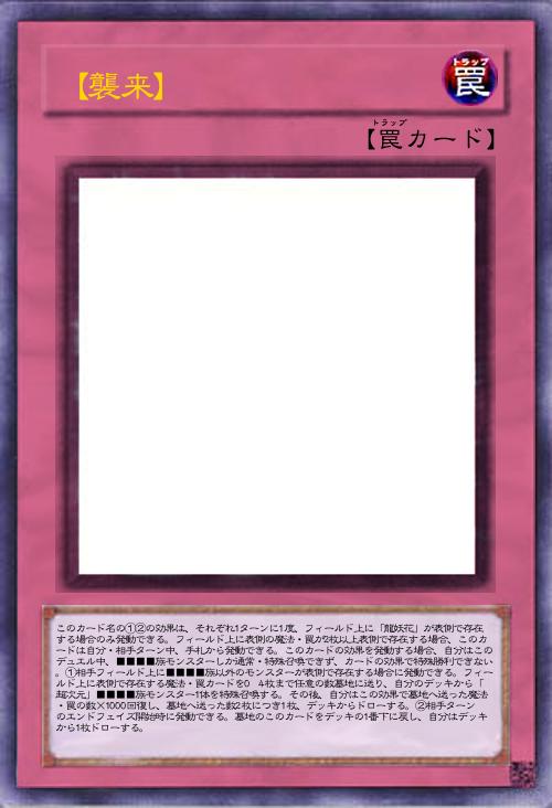 | このカード名の①②の効果は、それぞれ1ターンに1度、フィールド上に「龍妖花」が表側で存在する場合のみ発動できる。フィールド上に表側の魔法・罠が2枚以上表側で存在する場合、このカードは自分・相手ターン中、手札から発動できる。このカードの効果を発動する場合、自分はこのデュエル中、■■■■族モンスターしか通常・特殊召喚できず、カードの効果で特殊勝利できない。①相手フィールド上に■■■■族以外のモンスターが表側で存在する場合に発動できる。フィールド上に表側で存在する魔法・罠カードを0〜4枚まで任意の数墓地に送り、自分のデッキから「超次元」■■■■族モンスター1体を特殊召喚する。その後、自分はこの効果で墓地へ送った魔法・罠の数×1000回復し、墓地へ送った数2枚につき1枚、デッキからドローする。②相手ターンのエンドフェイズ開始時に発動できる。墓地のこのカードをデッキの1番下に戻し、自分はデッキから1枚ドローする。 | |||