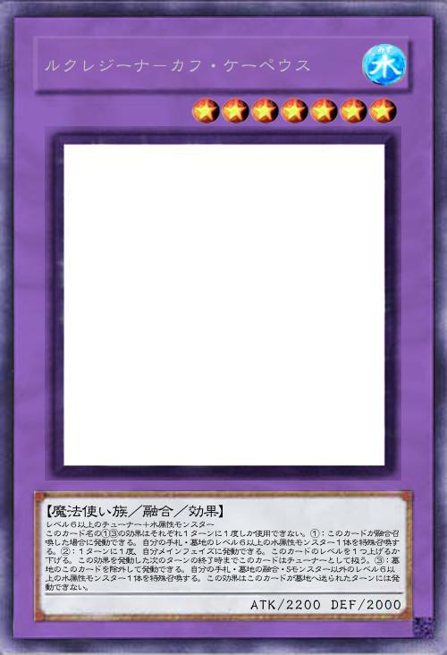 | レベル6以上のチューナー+水属性モンスター このカード名の①③の効果はそれぞれ1ターンに1度しか使用できない。①:このカードが融合召喚した場合に発動できる。自分の手札・墓地のレベル6以上の水属性モンスター1体を特殊召喚する。②:1ターンに1度、自分メインフェイズに発動できる。このカードのレベルを1つ上げるか下げる。この効果を発動した次のターンの終了時までこのカードはチューナーとして扱う。③:墓地のこのカードを除外して発動できる。自分の手札・墓地の融合・Sモンスター以外のレベル6以上の水属性モンスター1体を特殊召喚する。この効果はこのカードが墓地へ送られたターンには発動できない。 | |||