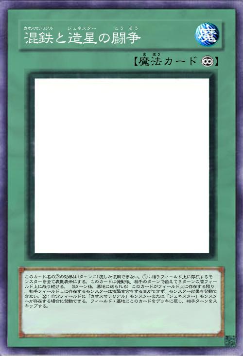 | このカード名の②の効果は1ターンに1度しか使用できない。①:相手フィールド上に存在するモンスターを全て表側表示にする。このカードは発動後、相手のターンで数えて3ターンの間フィールド上に残り続ける。(3ターン後、墓地に送られる)このカードがフィールド上に存在する限り、相手フィールド上に存在するモンスターは攻撃宣言をする事ができず、モンスター効果を発動できない。②:自分フィールドに「カオスマテリアル」モンスターまたは「ジェネスター」モンスターが存在する場合に発動できる。フィールド・墓地にこのカードをデッキに戻し、相手ターンをスキップする。 | |||