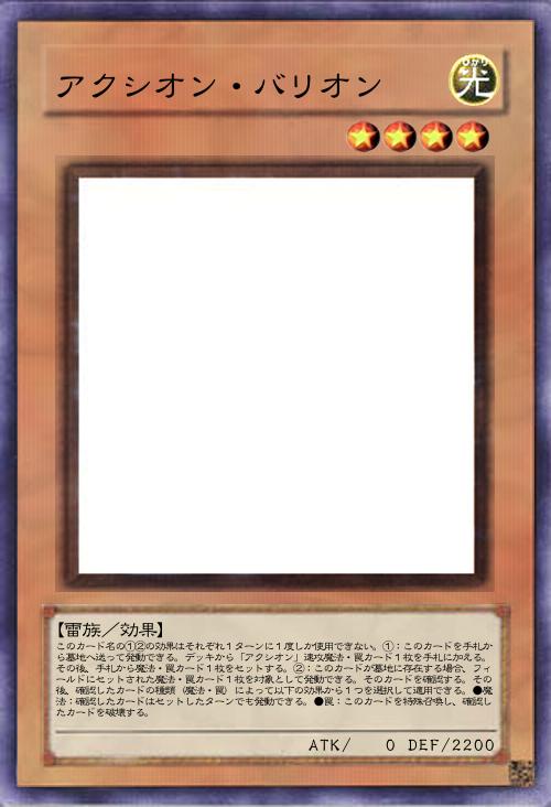 | このカード名の①②の効果はそれぞれ1ターンに1度しか使用できない。①:このカードを手札から墓地へ送って発動できる。デッキから「アクシオン」速攻魔法・罠カード1枚を手札に加える。その後、手札から魔法・罠カード1枚をセットする。②:このカードが墓地に存在する場合、フィールドにセットされた魔法・罠カード1枚を対象として発動できる。そのカードを確認する。その後、確認したカードの種類(魔法・罠)によって以下の効果から1つを選択して適用できる。●魔法:確認したカードはセットしたターンでも発動できる。●罠:このカードを特殊召喚し、確認したカードを破壊する。 | |||