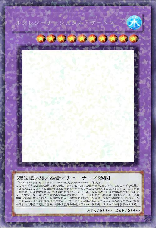 | 「ルクレジーナ」モンスター+レベル6以上のチューナー1体以上 このカード名の②③の効果はそれぞれ1ターンに1度しか使用できない。①:このカードの攻撃力・守備力はこのカードの融合素材としたチューナーのレベルの合計×100アップする。②:自分・相手ターンに発動できる。相手は自身の手札・フィールドのこのカードより攻撃力が高いモンスター1体をリリースしてこの効果を無効にできる。リリースしなかった場合、相手フィールドに表側表示で存在するこのカードの攻撃力以下の攻撃力を持つモンスターを全て破壊する。次のターン、このカードはこの効果を使用できない。③:自分・相手の手札・フィールドのモンスターがリリースされた場合に発動できる。相手は自身の手札・フィールドのモンスター1体をリリースする。 | |||