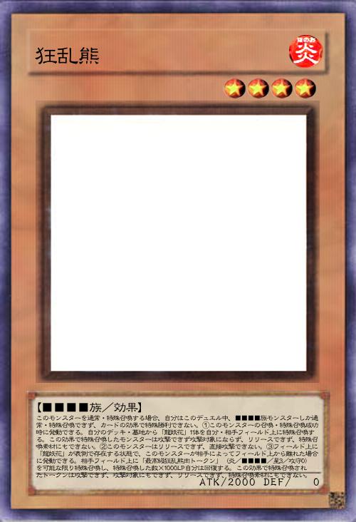 | このモンスターを通常・特殊召喚する場合、自分はこのデュエル中、■■■■族モンスターしか通常・特殊召喚できず、カードの効果で特殊勝利できない。①このモンスターの召喚・特殊召喚成功時に発動できる。自分のデッキ・墓地から「龍妖花」1体を自分・相手フィールド上に特殊召喚する。この効果で特殊召喚したモンスターは攻撃できず攻撃対象にならず、リリースできず、特殊召喚素材にもできない。②このモンスターはリリースできず、直接攻撃できない。③フィールド上に「龍妖花」が表側で存在する状態で、このモンスターが相手によってフィールド上から離れた場合に発動できる。相手フィールド上に「最高級狂乱熊肉トークン」(炎/■■■■/星3/攻守0)を可能な限り特殊召喚し、特殊召喚した数×1000LP自分は回復する。この効果で特殊召喚されたトークンは攻撃できず、攻撃対象にもできず、リリースできず、特殊召喚素材にもできない。 | |||