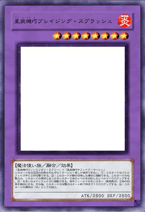 | 「星装機巧ヴァーミリオン・ラブリー」+「星装機巧サファイア・マーシィ」 このカード名の②③の効果はそれぞれ1ターンに1度しか使用できない。①:このカードはバトルフェイズ中に2回攻撃できる。②:このカードが融合召喚した場合に発動できる。このカードの攻撃力は、このカードの素材となったモンスター2体のレベルを合計したレベル×100アップする。③:お互いのメインフェイズに発動できる。相手フィールドのモンスター(表側表示)2体の効果を無効にする。その後、このカードの攻撃力はターン終了時まで1000アップする。④:このカードの属性は「水」としても扱う。 | |||