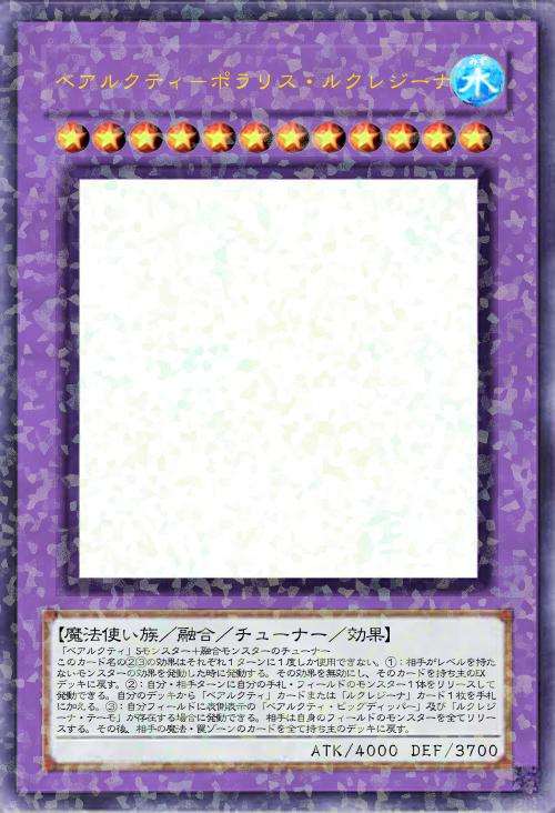 | 「ベアルクティ」Sモンスター+融合モンスターのチューナー このカード名の②③の効果はそれぞれ1ターンに1度しか使用できない。①:相手がレベルを持たないモンスターの効果を発動した時に発動する。その効果を無効にし、そのカードを持ち主のEXデッキに戻す。②:自分・相手ターンに自分の手札・フィールドのモンスター1体をリリースして発動できる。自分のデッキから「ベアルクティ」カードまたは「ルクレジーナ」カード1枚を手札に加える。③:自分フィールドに表側表示の「ベアルクティ・ビッグディッパー」及び「ルクレジーナ・テーモ」が存在する場合に発動できる。相手は自身のフィールドのモンスターを全てリリースする。その後、相手の魔法・罠ゾーンのカードを全て持ち主のデッキに戻す。 | |||