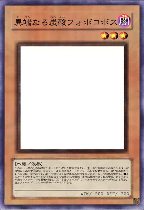 | このカード名の①の効果は1ターンに1度しか使用できない。①:自分の墓地に水族モンスターが3体以上存在する場合、自分フィールドのこのカードをリリースして発動できる。自分の墓地からレベル3以下の水族モンスター1体を以下の効果のみを持つモンスターとして特殊召喚する。●このカードが相手のカードの効果によって破壊された場合、または墓地へ送られた場合、デッキから水族モンスター1体を墓地へ送る。②:自分フィールドにレベル4のモンスターが存在する限り、自分フィールドのこのカードのレベルは4になる。 | |||