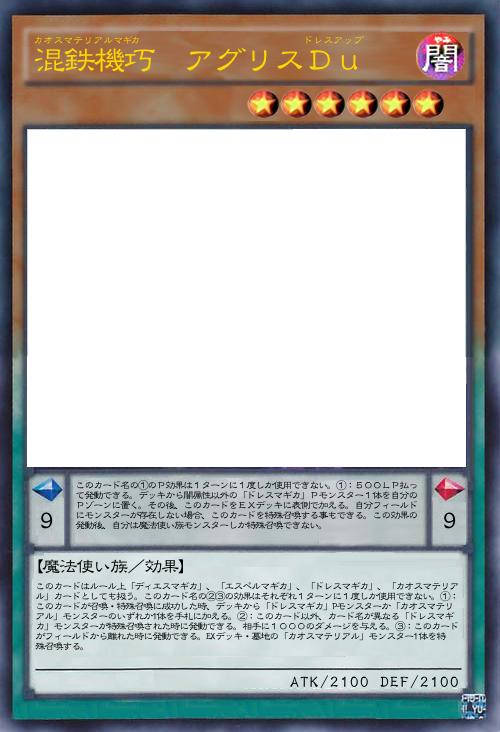 | このカードはルール上「ディエスマギカ」、「エスペルマギカ」、「ドレスマギカ」、「カオスマテリアル」カードとしても扱う。このカード名の②③の効果はそれぞれ1ターンに1度しか使用できない。①:このカードが召喚・特殊召喚に成功した時、デッキから「ドレスマギカ」Pモンスターか「カオスマテリアル」モンスターのいずれか1体を手札に加える。②:このカード以外、カード名が異なる「ドレスマギカ」モンスターが特殊召喚された時に発動できる。相手に1000のダメージを与える。③:このカードがフィールドから離れた時に発動できる。EXデッキ・墓地の「カオスマテリアル」モンスター1体を特殊召喚する。 | |||