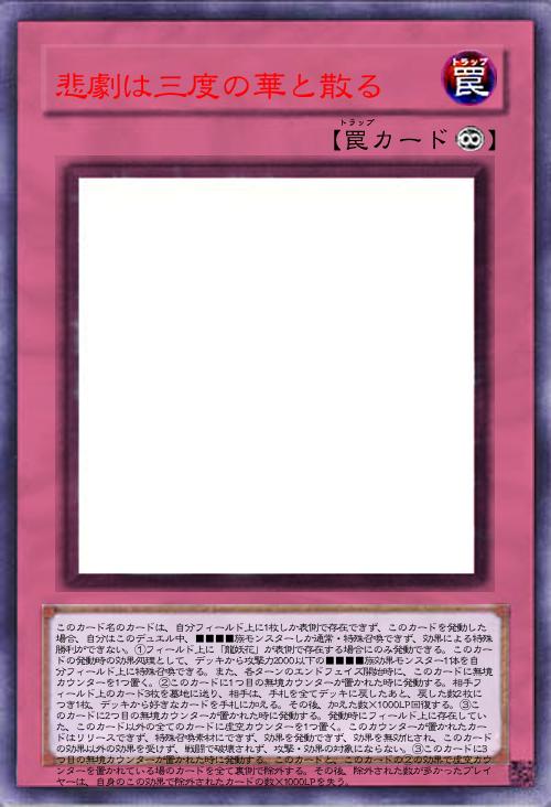 | このカード名のカードは、自分フィールド上に1枚しか表側で存在できず、このカードを発動した場合、自分はこのデュエル中、■■■■族モンスターしか通常・特殊召喚できず、効果による特殊勝利ができない。①フィールド上に「龍妖花」が表側で存在する場合にのみ発動できる。このカードの発動時の効果処理として、デッキから攻撃力2000以下の■■■■族効果モンスター1体を自分フィールド上に特殊召喚できる。また、各ターンのエンドフェイズ開始時に、このカードに無境カウンターを1つ置く。②このカードに1つ目の無境カウンターが置かれた時に発動する。相手フィールド上のカード3枚を墓地に送り、相手は、手札を全てデッキに戻したあと、戻した数2枚につき1枚、デッキから好きなカードを手札に加える。その後、加えた数×1000LP回復する。③このカードに2つ目の無境カウンターが置かれた時に発動する。発動時にフィールド上に存在していた、このカード以外の全てのカードに虚空カウンターを1つ置く。このカウンターが置かれたカードはリリースできず、特殊召喚素材にできず、効果を発動できず、効果を無効化され、このカードの効果以外の効果を受けず、戦闘で破壊されず、攻撃・効果の対象にならない。③このカードに3つ目の無境カウンターが置かれた時に発動する。このカードと、このカードの②の効果で虚空カウンターを置かれている場のカードを全て裏側で除外する。その後、除外された数が多かったプレイヤーは、自身のこの効果で除外されたカードの数×1000LPを失う。 | |||