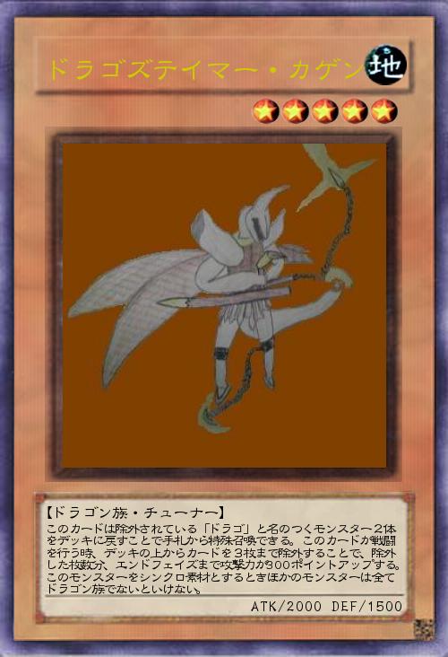 このカードは除外されている「ドラゴ」と名のつくモンスター2体をデッキに戻すことで手札から特殊召喚できる。このカードが戦闘を行う時、デッキの上からカードを3枚まで除外することで、除外した枚数分、エンドフェイズまで攻撃力が300ポイントアップする。このモンスターをシンクロ素材とするときほかのモンスターは全てドラゴン族でないといけない。 |