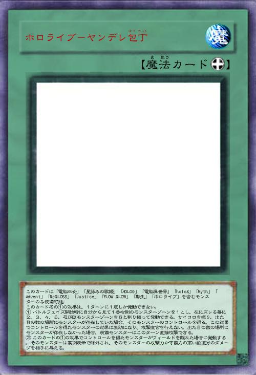 | このカードは「電脳巫女」「星詠みの歌姫」「HOLOG」「電脳異世界」「holoX」「Myth」「Advent」「ReGLOSS」「Justice」「FLOW GLOW」「期生」「ホロライブ」を含むモンスターのみ装備可能。 このカード名の①の効果は、1ターンに1度しか発動できない。 ①∶バトルフェイズ開始時に自分から見て1番右側のモンスターゾーンを1とし、左にズレる毎に2、3、4、5、及びEXモンスターゾーンを6と割り振って発動できる。サイコロを振り、出た目の数の場所にモンスターが存在していた場合、そのモンスターのコントロールを得る。この効果でコントロールを得たモンスターの効果は無効になり、攻撃宣言を行えない。出た目の数の場所にモンスターが存在しなかった場合、装備モンスターはこのターン直接攻撃できる。 ②∶このカードの①の効果でコントロールを得たモンスターがフィールドを離れた場合に発動する。そのモンスターは裏側表示で除外され、そのモンスターの攻撃力か守備力の高い数値分のダメージを相手に与える。 | |||