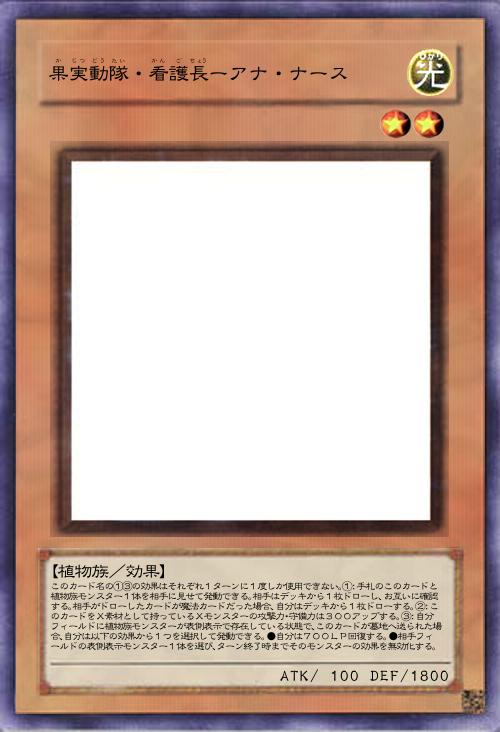 | このカード名の①③の効果はそれぞれ1ターンに1度しか使用できない。①:手札のこのカードと植物族モンスター1体を相手に見せて発動できる。相手はデッキから1枚ドローし、お互いに確認する。相手がドローしたカードが魔法カードだった場合、自分はデッキから1枚ドローする。②:このカードをX素材として持っているXモンスターの攻撃力・守備力は300アップする。③:自分フィールドに植物族モンスターが表側表示で存在している状態で、このカードが墓地へ送られた場合、自分は以下の効果から1つを選択して発動できる。●自分は700LP回復する。●相手フィールドの表側表示モンスター1体を選び、ターン終了時までそのモンスターの効果を無効化する。 | |||