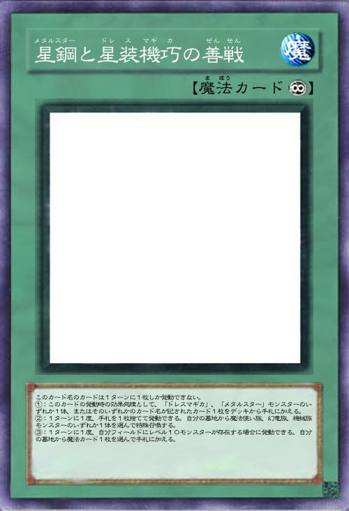 | このカード名のカードは1ターンに1枚しか発動できない。 ①:このカードの発動時の効果処理として、「ドレスマギカ」、「メタルスター」モンスターのいずれか1体、またはそのいずれかのカード名が記されたカード1枚をデッキから手札に加える。 ②:1ターンに1度、手札を1枚捨てて発動できる。自分の墓地から魔法使い族、幻竜族、機械族モンスターのいずれか1体を選んで特殊召喚する。 ③:1ターンに1度、自分フィールドにレベル10モンスターが存在する場合に発動できる。自分の墓地から魔法カード1枚を選んで手札に加える。 | |||
