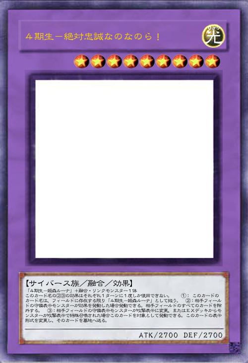 | 「4期生-姫森ルーナ」+融合・リンクモンスター1体 このカード名の②③の効果はそれぞれ1ターンに1度しか使用できない。 ①: このカードのカード名は、フィールドに存在する限り「4期生-姫森ルーナ」として扱う。 ②:相手フィールドの守備表示モンスターが効果を発動した場合発動できる。相手フィールドのすべてのカードを除外する。 ③:相手フィールドの守備表示モンスターが攻撃表示に変更、またはEXデッキからモンスターが攻撃表示で特殊召喚された場合このカードを対象として発動できる。このカードの表示形式を変更し、そのカードを墓地へ送る。 | |||