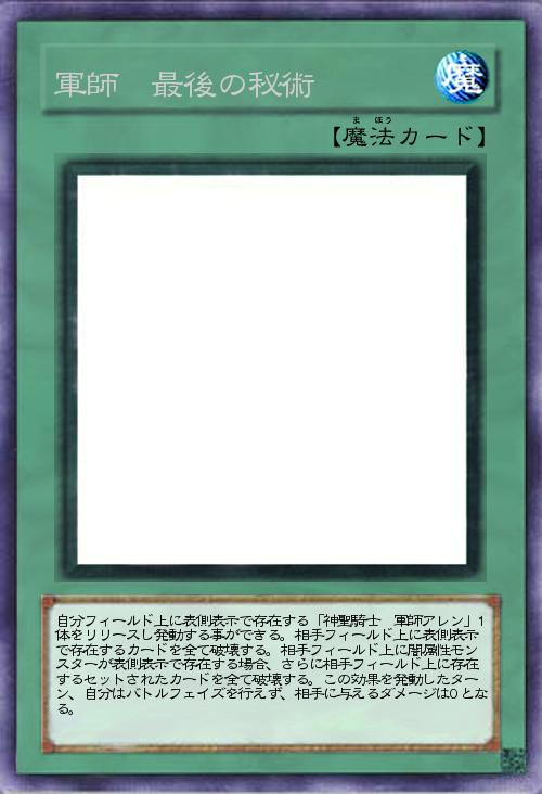 | 自分フィールド上に表側表示で存在する「神聖騎士 軍師アレン」1体をリリースし発動する事ができる。相手フィールド上に表側表示で存在するカードを全て破壊する。相手フィールド上に闇属性モンスターが表側表示で存在する場合、さらに相手フィールド上に存在するセットされたカードを全て破壊する。この効果を発動したターン、自分はバトルフェイズを行えず、相手に与えるダメージは0となる。 | |||