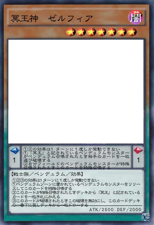 | ①②の効果は1ターンに1度しか発動できない ①「冥王」と記されているペンデュラムモンスターがペンデュラム召喚されたとき相手のカードを一枚選び破壊する ②自分フィールドのペンデュラムモンスターが特殊召喚されたときこのカードを特殊召喚する | |||