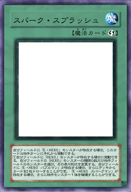 | 自分フィールドに「E・HERO」モンスターが存在する場合、このカードは相手ターンに手札から発動できる。 ①自分フィールドに「HERO」モンスターが存在する場合に発動できる。自分フィールドの「HERO」モンスターの種類の数だけ相手フィールドのモンスターを選び、その表示形式を変更する。自分フィールドに「E・HERO バブルマン」が存在する場合、さらにデッキからカードを2枚ドローすることができ、「E・HERO スパークマン」が存在する場合、さらに相手モンスター1体を破壊することができる。 | |||