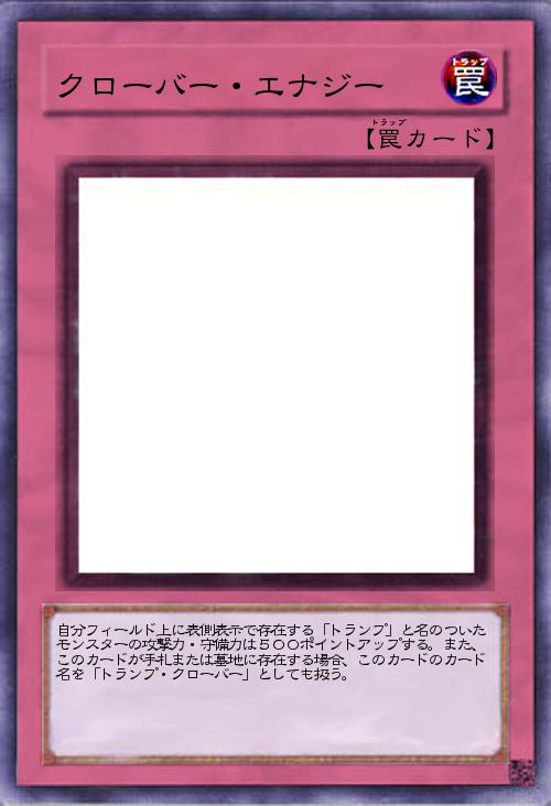 | 自分フィールド上に表側表示で存在する「トランプ」と名のついたモンスターの攻撃力・守備力は500ポイントアップする。また、このカードが手札または墓地に存在する場合、このカードのカード名を「トランプ・クローバー」としても扱う。 | |||