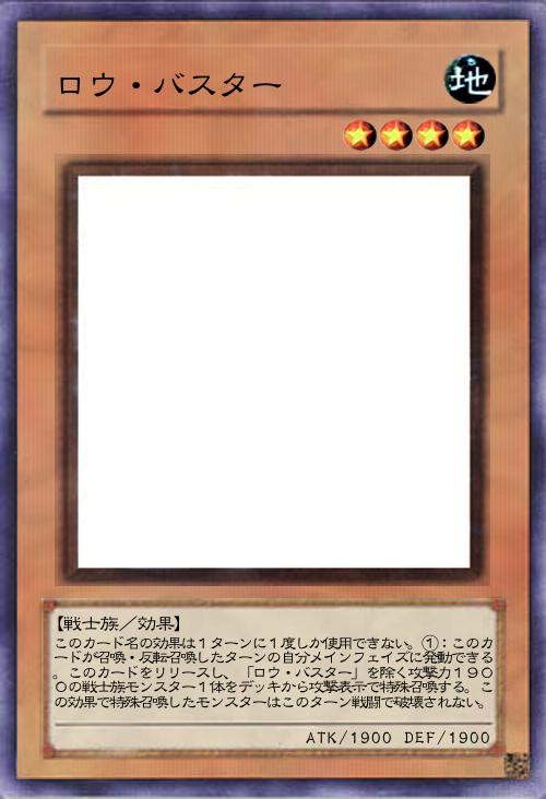 | このカード名の効果は1ターンに1度しか使用できない。①:このカードが召喚・反転召喚したターンの自分メインフェイズに発動できる。このカードをリリースし、「ロウ・バスター」を除く攻撃力1900の戦士族モンスター1体をデッキから攻撃表示で特殊召喚する。この効果で特殊召喚したモンスターはこのターン戦闘で破壊されない。 | |||