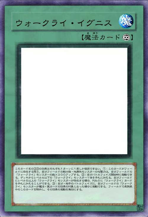 | このカード名の②③の効果はそれぞれ1ターンに1度しか使用できない。①:このカードがフィールドに存在する限り、自分フィールドの戦士族・地属性モンスターの攻撃力は、自分フィールドの「ウォークライ」モンスターの数×200アップする。②:自分バトルフェイズ開始時に発動できる。デッキからレベル4以下の「ウォークライ」モンスター1体を手札に加える。自分フィールドにレベル5以上の「ウォークライ」モンスターが存在する場合、代わりに「ウォークライ」カードを手札に加えることができる。③:自分・相手のバトルフェイズに、自分フィールドの「ウォークライ」モンスターが魔法・罠カードの効果の対象となった場合に発動できる。フィールドで表側表示のこのカードを除外し、その効果の発動を無効にする。 | |||