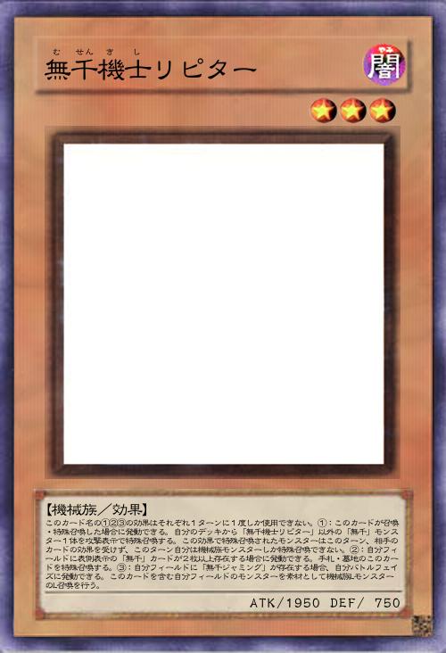 | このカード名の①②③の効果はそれぞれ1ターンに1度しか使用できない。①:このカードが召喚・特殊召喚した場合に発動できる。自分のデッキから「無千機士リピター」以外の「無千」モンスター1体を攻撃表示で特殊召喚する。この効果で特殊召喚されたモンスターはこのターン、相手のカードの効果を受けず、このターン自分は機械族モンスターしか特殊召喚できない。②:自分フィールドに表側表示の「無千」カードが2枚以上存在する場合に発動できる。手札・墓地のこのカードを特殊召喚する。③:自分フィールドに「無千ジャミング」が存在する場合、自分バトルフェイズに発動できる。このカードを含む自分フィールドのモンスターを素材として機械族LモンスターのL召喚を行う。 | |||